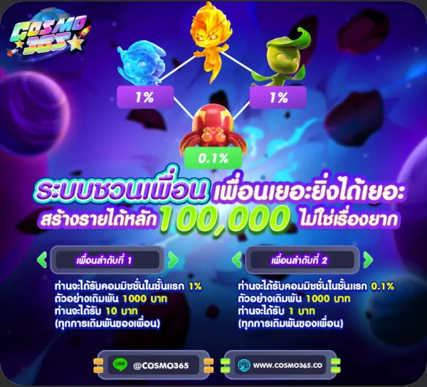 - ระบบแนะนำเพื่อนรับรายได้ 2 ชั้น: สร้างรายได้ Passive Income หลักแสนง่ายๆ เพียงแชร์ลิงก์ให้เพื่อน รับค่าคอมจากยอดเล่นเพื่อนชั้นที่หนึ่ง 1% และชั้นที่สองอีก 0.1% ตลอดชีพ